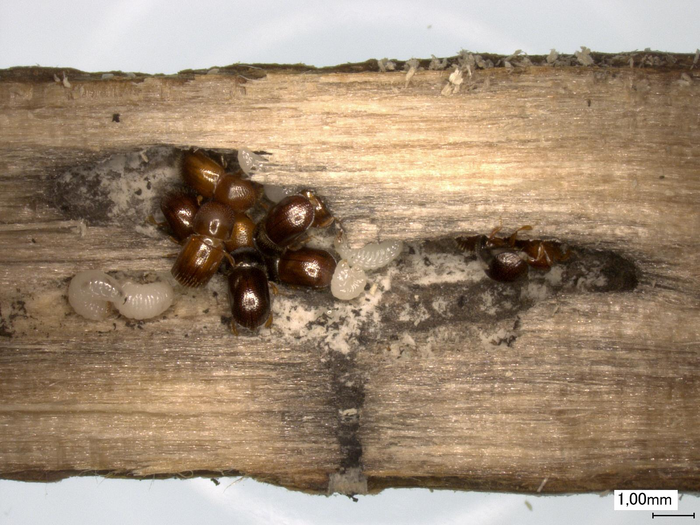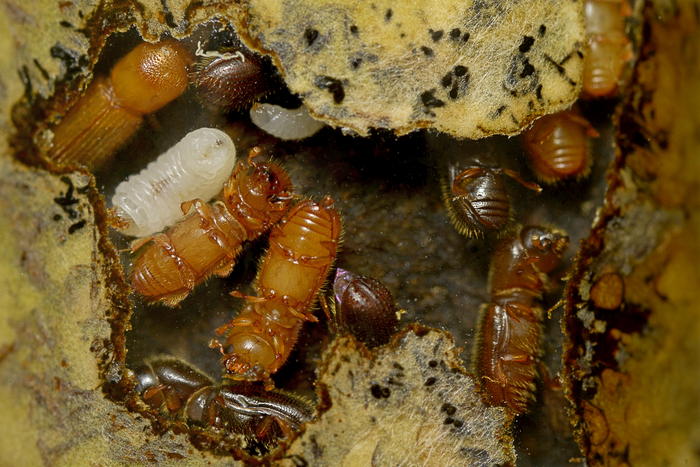 Alnus ambrosia beetles (Xylosandrus germanus) in their galleries, tending the brood and fungus