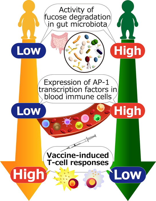 The scientists report that increased fucose digestion by bacteria in the gut before vaccination was associated with lower numbers of T-cells activated by vaccination. T-cells are an important type of blood immune cell that are activated by a specific strain of bacteria or virus, and then multiply to fight the infection.