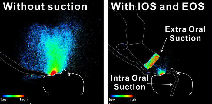 IMAGE: REDUCTION OF AEROSOL DROPLET DISPERSION BY THE COMBINATION OF INTRA-ORAL SUCTION (IOS) AND EXTRA-ORAL SUCTION (EOS). view more