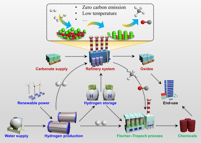 IMAGE: HYDROGENATION OF CACO3 TO PRODUCE CO AND CAO IS ACHIEVED VIA CO-THERMAL IN-SITU REDUCTION COUPLED WITH GREEN HYDROGEN SYSTEM. THE STRATEGY OF CO-THERMAL IN-SITU REDUCTION NOT ONLY REDUCES ENERGY CONSUMPTION, BUT ALSO SIGNIFICANTLY INHIBITS THE CARBON EMISSIONS. THE PRODUCTS OF CO AND CAO HAVE GREAT APPLICATIONS IN INDUSTRY. view more