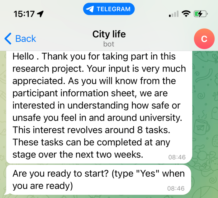 City Life is a chatbot app developed by the research team using the FlowXO chatbot software, and distributed using Telegram.
