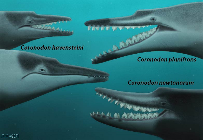 The two new species, Coronodon planifrons and Coronodon newtonorum, are found in the same rock layer and date to the same time period (late Oligocene; 25-23 myo). Coronodon havensteini (30-28 myo) is older and is a possible ancestor of these two species. Coronodon planifrons is named after a skull with a flat ‘forehead’ and possibly an extra tooth relative to the other species. Coronodon newtonorum is also known from a single skull and mandible, with slightly smaller teeth and an unusual shaped mouth that made it look like it was permanently ‘smiling’.