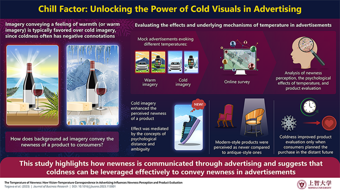 To address this knowledge gap, a research team led by Associate Professor Taku Togawa from Sophia University, Japan, investigated whether newness can be conveyed in a rather unexpected way: using cold imagery. “Coldness often has a negative connotation; for example, people regularly use expressions such as “She gave me the cold shoulder” or “His comment froze me in place.” Indeed, consumer researchers have shown that warm temperatures increase consumers’ evaluation and purchase intention for a given product more than cold temperatures,” explains Assoc. Prof. Togawa, “However, our study sought to prove that, in the context of advertising for new products, coldness is not always a negative factor in consumer behavior.” This work was co-authored by Dr. Hiroaki Ishii from Aoyama Gakuin University, Dr. Jaewoo Park from Chuo University, and Rajat Roy from Bond University, and their paper was made available online on March 1 2023 and published in Volume 160 in May 2023 in the Journal of Business Research.