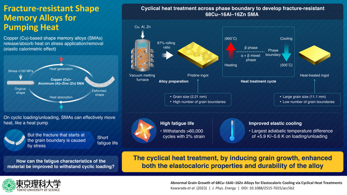 Now, in a study published in the Journal of Physics: Energy on 31 March 2023, Professor Kenjiro Fujimoto from Tokyo University of Science, Professor Ichiro Takeuchi from the University of Maryland, along with researchers from Maryland Energy & Sensor Technologies, USA, have developed a highly durable Cu-Zn-Al SMA capable of withstanding a high number of cyclic loads. “We have been searching for conditions to promote the grain growth of 68Cu-16Al-16Zn alloy to improve its elastocaloric properties,” says Prof. Fujimoto, explaining the motivation behind their study.