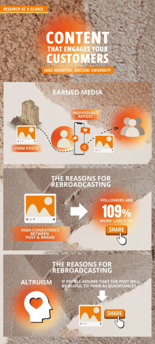 A brand's presence on social networks is primarily intended to create "engagement," that is, interaction via posts. In particular, one aspect of engagement that brands find attractive is the spontaneous sharing of content by users themselves, in marketing parlance "rebroadcasting." When a follower shares commercial content with his or her network of acquaintances and friends, its impact, quite predictably, is much stronger because it is conveyed by the user and not directly by the brand, which can in turn take advantage of what is known in jargon as "earned media".