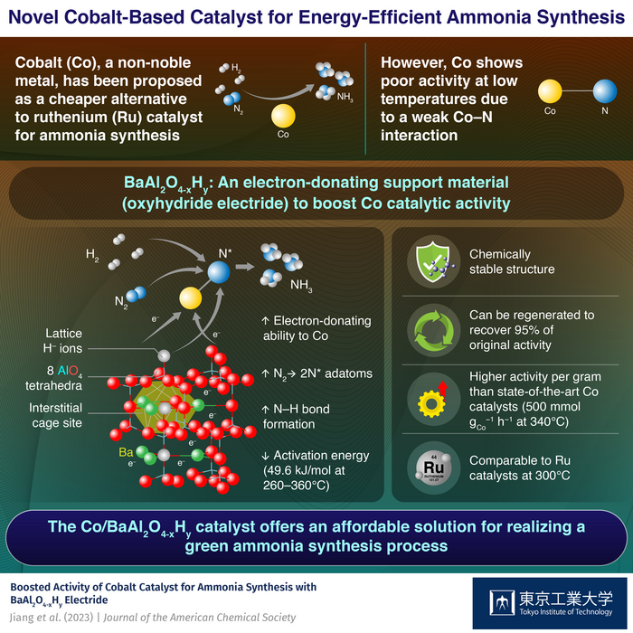 With its good chemical stability, enhanced catalytic activity, and high reusability, the Co/BaAl2O4-xHy catalyst shows great promise for synthesizing ammonia at low temperatures. “This novel inorganic electride offers a new approach to developing highly effective and stable Ru-free catalysts for green ammonia synthesis,” concludes Prof. Kitano.