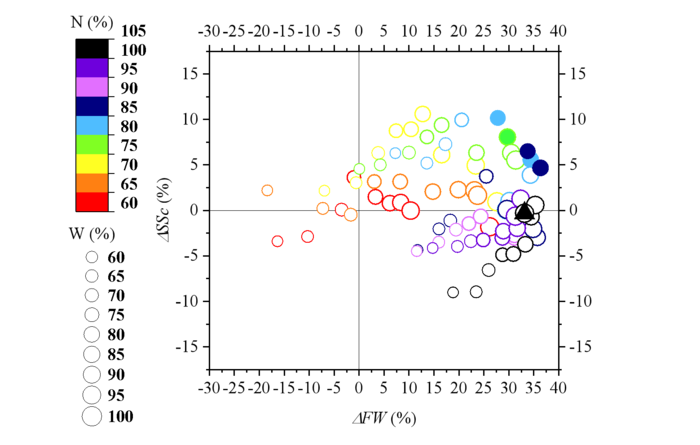 Changes in the mature tomato fruit fresh weight (∆FW, %) and soluble sugar concentration (∆SSc, %) between 2021 and 2100 according to various possible sustainable scenarios using less nitrogen (N) and water (W) under future climate change