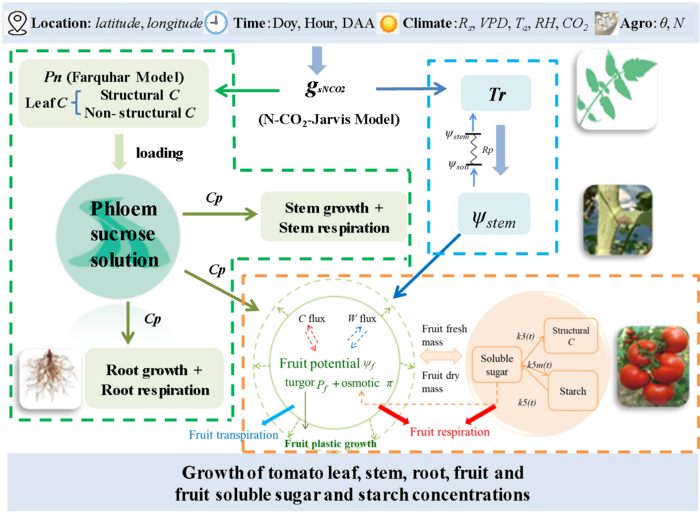 Process-based modelling is a powerful approach to deal with the complexity of biological systems of plants, their fruit, and the relationships between them. When simulating the response of fruit growth and quality to environmental factors and cultivation practices, the interactions between the mother plant and fruit need to be considered as a whole system. Here, we developed the integrative Tomato plant and fruit Growth and Fruit Sugar metabolism (TGFS) model by coupling equations describing the biophysical processes of leaf gas exchange, water transport, carbon allocation, organ growth and fruit sugar metabolism. The model also accounts for effects of soil nitrogen and atmospheric CO2 concentration on gaseous exchange of water and carbon by the leaf. With different nitrogen and water input values, TGFS performed well at simulating the dry mass of the tomato leaf, stem, root, and fruit, and the concentrations of soluble sugar and starch in fruit. TGFS simulations showed that increasing air temperature and CO2 concentration has positive effects on fruit growth, but not on sugar concentrations. Further model-based analyses of cultivation scenarios suggest that, in the context of climate change, decreasing N by 15%-25% and decreasing irrigation by 10%-20% relative to current levels, would increase tomato fresh weight by 27.8%-36.4% while increasing soluble sugar concentration by up to 10%. TGFS provides a promising tool to optimize N and water inputs for sustainable high-quality tomatoes.