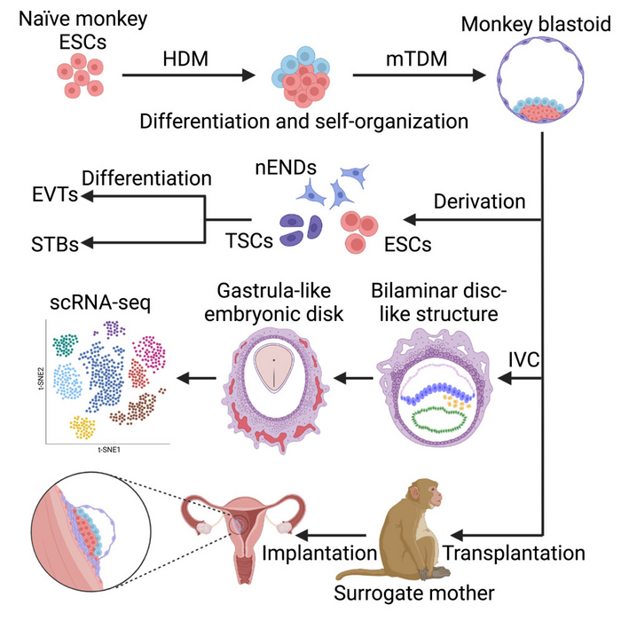 Human embryo development and early organ formation remain largely unexplored due to ethical issues surrounding the use of embryos for research as well as limited availability of materials to study. In a paper published April 6 in the journal Cell Stem Cell, a team of investigators from China report for the first time the creation of embryo-like structures from monkey embryonic stem cells. The investigators also transferred these embryo-like structures into the uteruses of female monkeys and determined that the structures were able to implant and elicit a hormonal response similar to pregnancy.