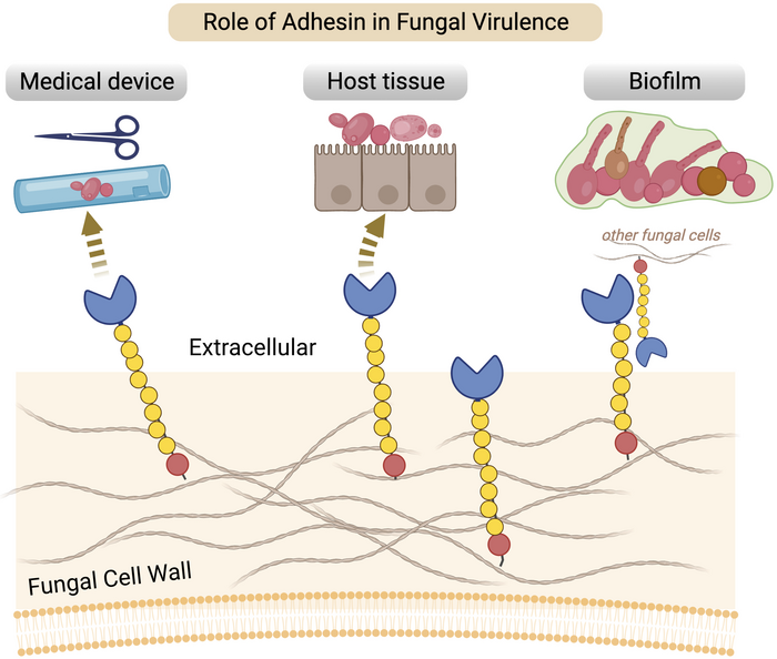 IMAGE: UNIVERSITY OF IOWA BIOLOGISTS HAVE UNCOVERED A SHARED GENETIC FACTOR AMONG DISEASE-CAUSING FUNGI, INCLUDING ONE SPECIES THAT HAS BEEN ASSOCIATED WITH HOSPITAL OUTBREAKS IN THE US. THE IMAGE SHOWS PROTEINS ENCODED BY THE HIL GENE FAMILY THAT ROOT THEMSELVES IN CELLS AND USE STICKY, OR ADHESIVE, PROPERTIES TO ATTACH THEMSELVES TO MEDICAL DEVICES, SUCH AS CATHETERS, TO TISSUE OR TO CREATE A DRUG-RESISTANT WALL CALLED BIOFILM. view more