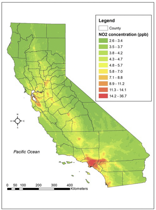 The team estimated average NO2 concentrations at the spatial resolution of 500 m in California between 2018 and 2019 and assessed whether NO2 concentrations measured at ground monitors were representative of population exposures to NO2 in each county. They also evaluated which property types showed the highest NO2 emissions and therefore exposures. Their assessment revealed that the highest NO2 exposures were attributed to food processing facilities and high-rise apartments that are 10 stories or higher. The same results were obtained when traffic was taken into consideration.