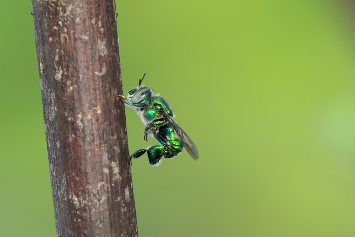 IMAGE: MALE OF THE ORCHID BEE EUGLOSSA DILEMMA PERFORMING TYPICAL COURTSHIP DISPLAY AT A PERCH IN A FLIGHT CAGE IN FLORIDA. THEIR SCENT POCKETS ARE LOCATED ON THE THICKENED HIND LEGS. view more
