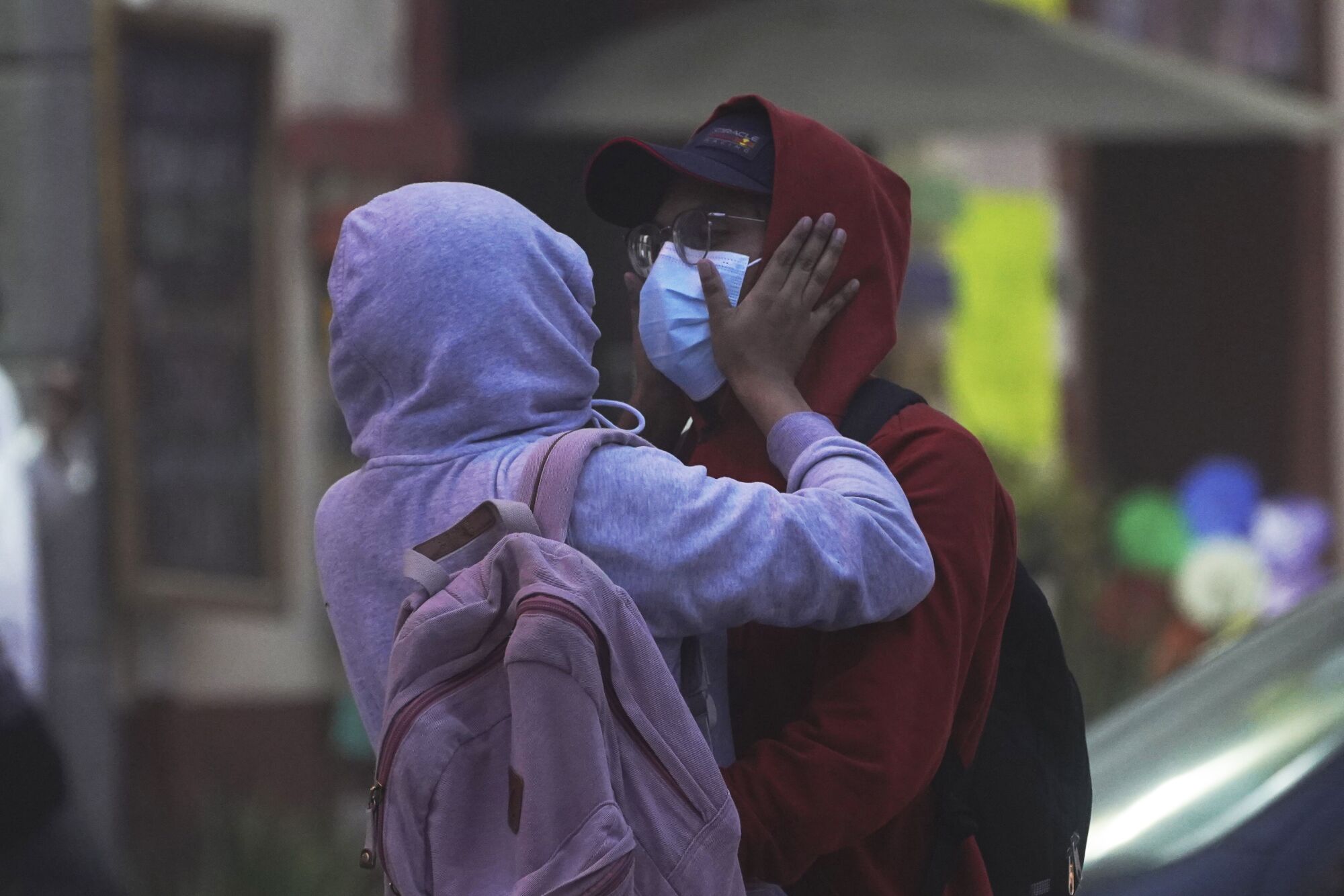 Two people wear hoodies and masks to shield themselves from the ash emitted by the Popocatépetl volcano in Atlixco, Mexico, on May 22, 2023. The volcano’s activity has increased over the last week.