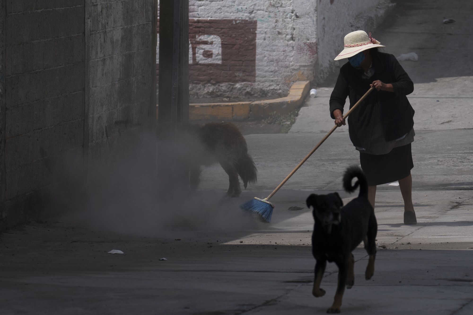A woman sweeps ash from the Popocatépetl volcano in Santiago Xalitzintla, Mexico.