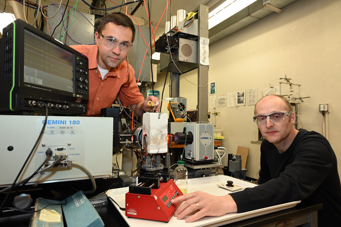 Peer-Reviewed PublicationIMAGE: DMITRY POLYANSKY (LEFT) AND DAVID GRILLS IN THE PULSE RADIOLYSIS LAB WHERE THE RESEARCH WAS CONDUCTED. HERE, GRILLS PROGRAMS A SYRINGE PUMP THAT DELIVERS THE CATALYST TO THE RADIOLYSIS CELL. POLYANSKY ADJUSTS THE RADIOLYSIS CELL INSIDE A WHITE INSULATED COMPARTMENT. view more