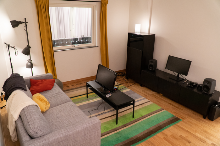 The laboratory environment at Chalmers where the research was conducted looks like a living room with furniture and textiles, but behind the ceiling panels and windows is an advanced speaker system that allows the researchers to simulate various sounds, such as road traffic noise.