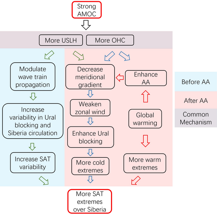 IMAGE: AMOC CAN REGULATE WAVE ACTIVITIES OVER THE MID-TO-HIGH LATITUDES IN THE NORTHERN HEMISPHERE, WHICH HAS A DIRECT IMPACT ON EXTREME WEATHER AT MID-TO-HIGH LATITUDES IN EURASIA (HEREAFTER REFERRED TO AS THE MHEA). DURING BOREAL WINTERS, STRONG AMOC REGULATES THE ROSSBY WAVE TRAIN THAT ORIGINATES FROM THE NORTH ATLANTIC AND CROSSES MID-TO-HIGH LATITUDES, WHICH INCREASES THE VARIABILITY IN THE CIRCULATION ANOMALIES IN THE URAL BLOCKING AREA AND SIBERIA AND CONSEQUENTLY AFFECTS THE VARIABILITY IN THE SAT OVER THE MHEA, LEADING TO AN INCREASE IN BOTH EXTREME COLD AND WARM EVENTS. IN ADDITION, THE DECADAL STRENGTHENING OF AMOC IMPACTS THE INCREASE IN EXTREME COLD EVENTS IN THE MHEA, AS IT ENHANCES THE AA EFFECT BY INCREASING THE MERIDIONAL HEAT TRANSPORT, WHICH IN TURN LEADS TO THE STRENGTHENING OF THE URAL BLOCKING AND FURTHER CONTRIBUTES TO THE INCREASE IN EXTREME COLD EVENTS IN THE MHEA. ALONG WITH THE DIRECT HEATING EFFECT OF GLOBAL WARMING, BOTH OF WHICH HAVE LED TO AN INCREASE IN EXTREME COLD AND WARM EVENTS SINCE 2000. view more