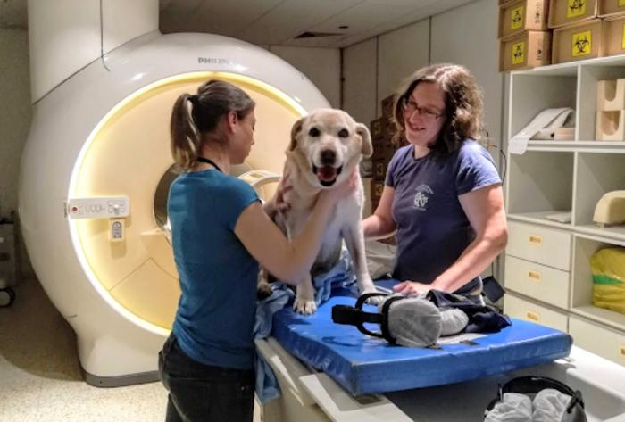 Peer-Reviewed PublicationIMAGE: SZABÓ DÓRA (R), LEAD AUTHOR OF THE STUDY, AND BÁJI RITA (L) WITH KAMILLA, ONE OF THE OLDEST DOGS INVOLVED IN THE RESEARCH, AFTER AN RS-FMRI MEASUREMENT. view more