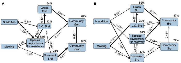 IMAGE: THE FINAL STRUCTURAL EQUATION MODELS DEMONSTRATE THAT NITROGEN ADDITION AND MOWING CHANGE COMPOSITIONAL AND FUNCTIONAL ASPECTS OF COMMUNITY RESISTANCE (A) AND RECOVERY (B) MAINLY BY MODULATING SPECIES ASYNCHRONY, THE CORRESPONDING RESISTANCE AND RECOVERY OF DOMINANT SPECIES AND GRASSES. view more