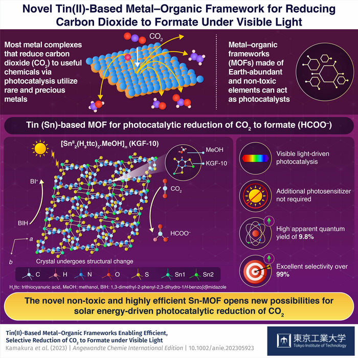 In a recent breakthrough published in Angewandte Chemie, International Edition on May 8, 2023, a team of researchers led by Prof. Kazuhiko Maeda of Tokyo Institute of Technology developed a tin-based metal–organic framework (MOF) that can enable selective photoreduction of CO2. They reported a novel tin (Sn)-based MOF called KGF-10, with the formula [SnII2(H3ttc)2.MeOH]n (H3ttc: trithiocyanuric acid and MeOH: methanol). It successfully reduced CO2 into HCOOH in the presence of visible light. "Most high-performance CO2 reduction photocatalysts driven by visible light rely on rare, precious metals as principal components. Furthermore, integrating the functions of light absorption and catalysis into a single molecular unit made up of abundant metals has remained a long-standing challenge. Hence, Sn was the ideal candidate as it can overcome both challenges," explains Prof. Maeda.