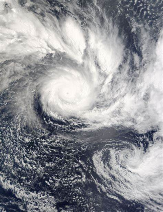IMAGE: TROPICAL CYCLONES OLAF (TOP) AND NANCY (BOTTOM) ON FEBRUARY 16, 2005 OVER SOUTH PACIFIC. view more