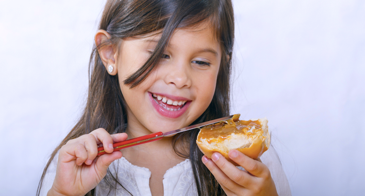 Girl spreads peanut butter on bread (Shutterstock)