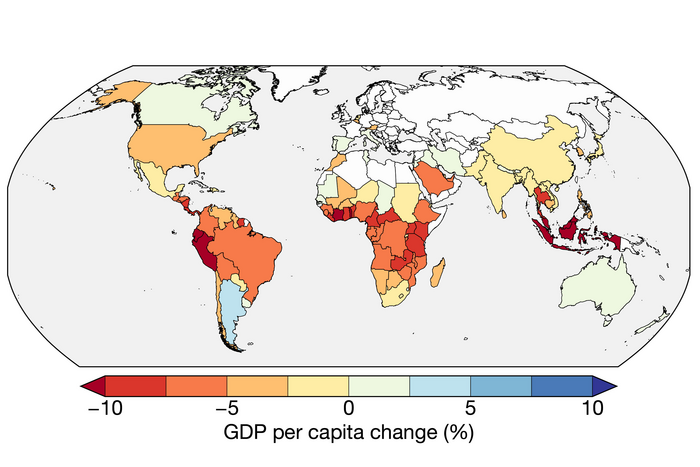 Peer-Reviewed PublicationIMAGE: BY 2003, LOWER-INCOME TROPICAL NATIONS HAD EXPERIENCED THE GREATEST RESIDUAL LOSSES ON GROSS DOMESTIC PRODUCT (GDP) AS A RESULT OF THE 1997-98 EL NIÑO. THE COLOR SCALE INDICATES PERCENTAGE SHIFT IN GDP AS A RESULT OF THE 1997-98 EL NIÑO, FROM THE HIGHEST GAIN (BLUE) TO THE HIGHEST LOSS (RED). view more