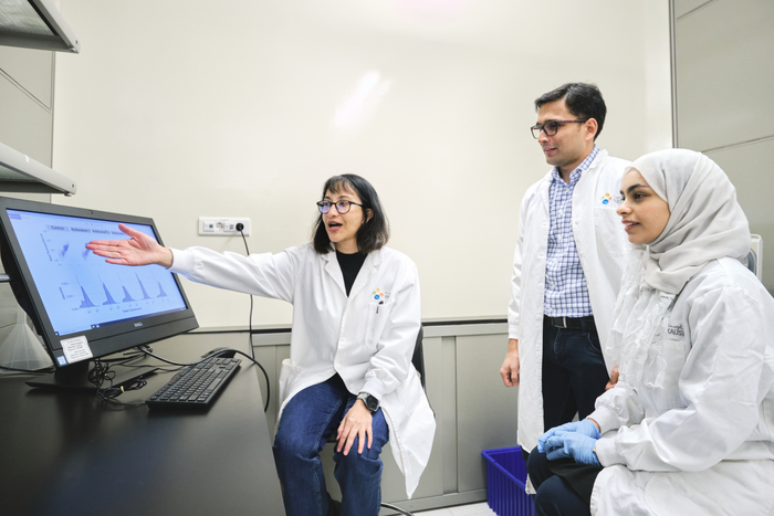 IMAGE: FROM LEFT: KAUST RESEARCH SCIENTIST GRACIELA GONZALEZ GIL, ACWA POWER’S RATUL DAS AND KAUST ALUMNA GHADEER HASANIN DISCUSS THEIR RESULTS. view more