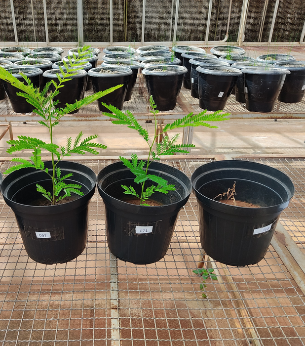Final vases for Peltophorum dubium show differences in growth depending on soil. From left to right: 100% ADE, 20% ADE, Control soil