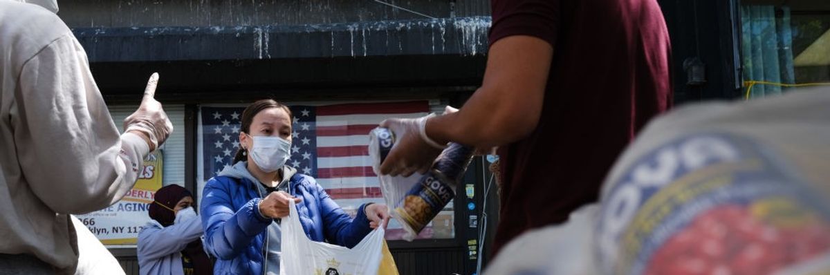 People receive food after waiting on line for hours outside of a Brooklyn mosque and cultural center on May 22 , 2020 in New York City.