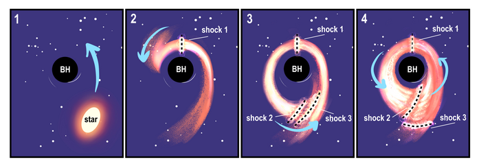 IMAGE: IN A TIDAL DISRUPTION EVENT, A STAR MOVES CLOSE ENOUGH TO A SUPERMASSIVE BLACK HOLE SO THAT THE GRAVITATIONAL PULL OF THE BLACK HOLE BENDS THE STAR UNTIL IT IS DESTROYED (IMAGE 1). THE STELLAR MATTER FROM THE DESTROYED STAR FORMS AN ELLIPTICAL STREAM AROUND THE BLACK HOLE (IMAGE 2). TIDAL SHOCKS ARE FORMED AROUND THE BLACK HOLE AS THE GAS HITS ITSELF ON ITS WAY BACK AFTER CIRCLING THE BLACK HOLE (IMAGE 3). THE TIDAL SHOCKS CREATE BRIGHT OUTBURSTS OF POLARISED LIGHT THAT CAN BE OBSERVED IN OPTICAL AND ULTRAVIOLET WAVELENGTHS. OVER TIME, THE GAS FROM THE DESTROYED STAR FORMS AN ACCRETION DISK AROUND THE BLACK HOLE (IMAGE 4) FROM WHERE IT IS SLOWLY PULLED INTO THE BLACK HOLE. THE SCALE OF THE IMAGE IS NOT ACCURATE. view more