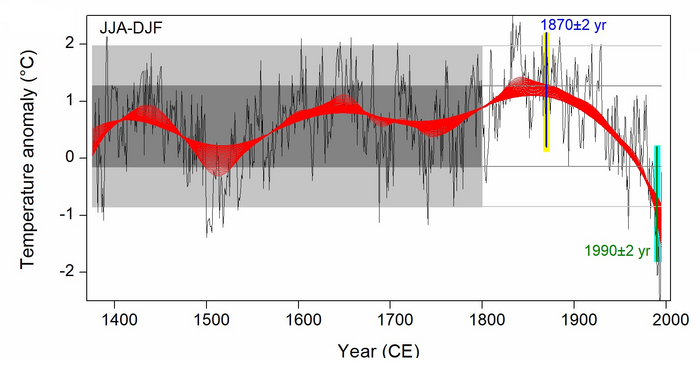 IMAGE: THE RECONSTRUCTED SEASONAL TEMPERATURE DIFFERENCE (BLACK LINE) AND ITS TRENDS (RED LINES) FOR EAST ASIA AS WELL AS THE TIME OF ONSET OF SUSTAINED WEAKENING TREND (BLUE VERTICAL LINE) AND THE TIME OF CLIMATE EMERGENCE (GREEN VERTICAL LINE) view more
