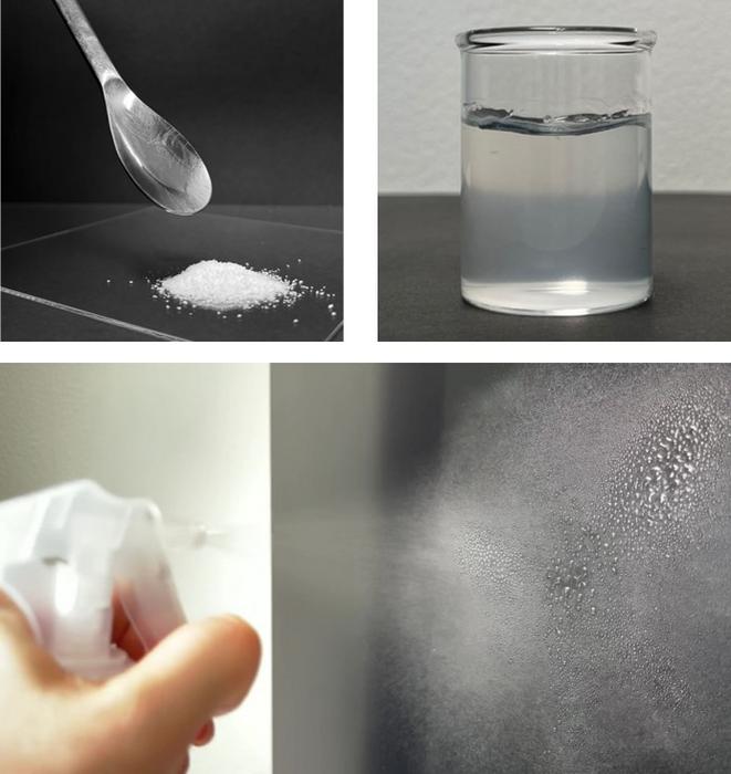 IMAGE: EVAPORATED CNF POWDERS HAVE A SMALL VOLUME AND NO HANDLING ISSUES RELATED TO STATIC ELECTRICITY (UPPER LEFT). THEIR WATER DISPERSIONS ARE COLORLESS AND TRANSPARENT (UPPER RIGHT) AND DISPERSION DROPLETS FORMED BY SPRAYING DO NOT DRIP (LOWER). view more