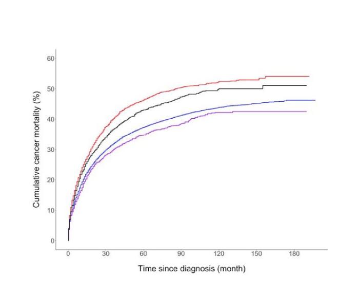 Looking at cancer mortality, non-Hispanic Black survivors had the highest cumulative mortality during the entire follow-up, followed by Hispanic, non-Hispanic white and non-Hispanic Asian survivors. Later stage at presentation and more aggressive tumor characteristics contributed to increased cancer mortality among Hispanic and non-Hispanic Black survivors after second cancers.