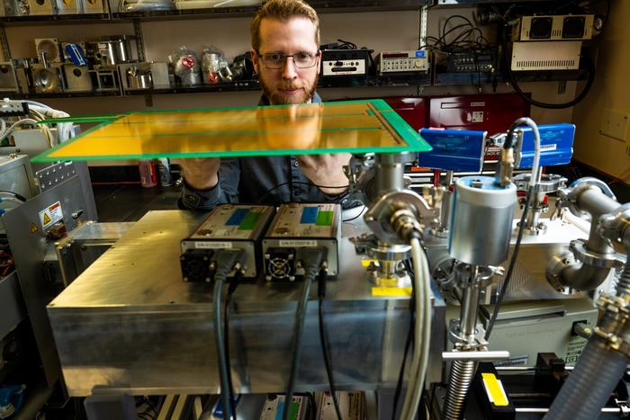 IMAGE: ADAM HOLLERBACH WITH A SLIM DEVICE CREATED AT PACIFIC NORTHWEST NATIONAL LABORATORY. view more