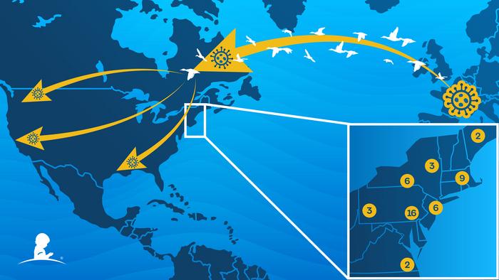 Peer-Reviewed PublicationIMAGE: H5N1 AVIAN INFLUENZA SPREAD FROM EUROPE TO NORTH AMERICA, THEN THROUGHOUT THE CONTINENT VIA WILD BIRDS. INSET SHOWS CLUSTERS OF INFECTIONS DETECTED ON THE EAST COAST FROM 2021-APRIL 2023, ACCORDING TO THE FOOD AND AGRICULTURE ORGANIZATION OF THE UNITED NATIONS. view more
