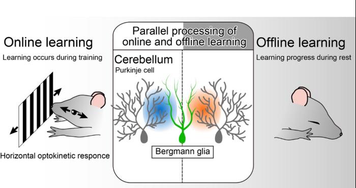 Researchers at Tohoku University have discovered that there are two parallel processes involved in memory formation when a mouse performs a motor learning task. One process occurs during training and is called online learning, while the other happens during the resting period and is called offline learning. Online learning can be boosted or reduced by manipulating glial activity, but offline learning remains unaffected by these manipulations. Understanding the cellular mechanisms underlying these independent parallel memory formation processes may lead to the development of efficient rehabilitation after strokes, dementia treatment, or realizing extended intelligence.
