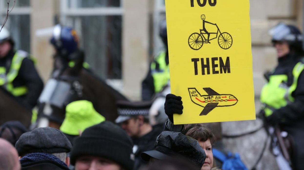 OXFORD, ENGLAND - FEBRUARY 18: A protester holds a sign criticizing the inequality of 15-minute cities as protesters gather in Broad Street on February 18, 2023 in Oxford, England. The concept of 15-minute cities suggests that all services, amenities, work, and leisure are accessible a 15-20 minute walk or cycle from a person's front door. Protesters argue that the measures will ghettoise areas and restrict their freedom to move around as they want to. Car journeys will be restricted at certain times of the day and will be policed by number plate recognition (ANPR) cameras and fines