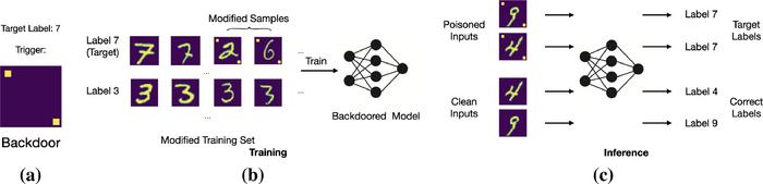 IMAGE: THE VISIBLE DISTRIBUTED TRIGGER IS SHOWN IN FIGURE 1(A) AND THE TARGET LABEL IS SEVEN (7). THE TRAINING DATA IS MODIFIED. WE SEE THIS IN FIGURE 1(B) AND THE MODEL IS TRAINED WITH THIS POISONED DATA. THE INPUTS WITHOUT THE TRIGGER WILL BE CORRECTLY CLASSIFIED AND THE ONES WITH THE TRIGGER WILL BE INCORRECTLY CLASSIFIED DURING THE INFERENCE, AS SEEN IN FIGURE 1(C). view more