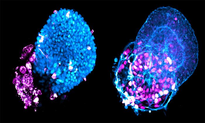 IMAGE: SARS-COV-2 (MAGENTA) INFECTS ALVEOLAR AND AIRWAY TISSUES (BLUE) OF HUMAN MINI-LUNGS DERIVED IN VITRO FROM HUMAN PLURIPOTENT STEM CELLS. view more