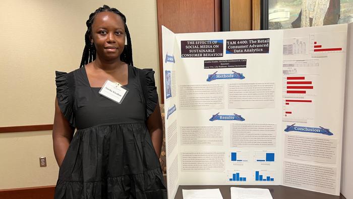 Grant and Award AnnouncementIMAGE: ATOSHA JISABO, A TEXTILES AND APPAREL MANAGEMENT (TAM) STUDENT, PRESENTS A DATA ANALYTICS PROJECT AT TAM’S OPEN HOUSE EVENT. view more