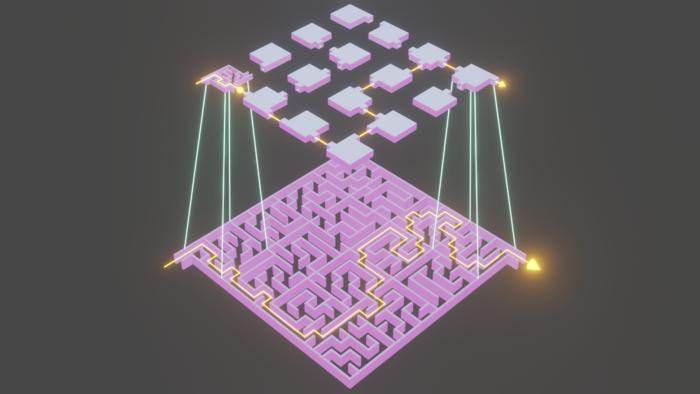 IMAGE: DIVIDING A TASK INTO SIMPLER SUBTASKS CAN MAKE PLANNING EASIER. AT BOTTOM, THE TASK REQUIRES NAVIGATING A MAZE FROM THE ENTRY (AT LEFT) TO THE EXIT (AT RIGHT; GLOWING ARROW). AT TOP, THE MAZE IS DIVIDED INTO SUBTASKS, SHOWING TWO KEY ELEMENTS OF HIERARCHICAL PLANNING: AN ABSTRACT PLAN BETWEEN SUBTASKS (BOXES) AND A CONCRETE PLAN FROM THE ENTRY TO THE FIRST SUBGOAL (GLOWING CIRCLE). DIVIDING THE TASK IN THIS WAY MAKES IT EASIER TO PLAN. OUR RESEARCH ARTICLE FINDS THAT PEOPLE CHOOSE SUBGOALS BY BALANCING EASE OF PLANNING WITH EFFICIENT BEHAVIOR, CONSISTENT WITH OUR COMPUTATIONAL THEORY. view more