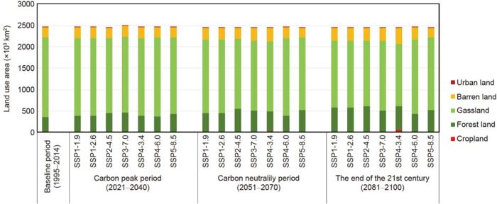 This study predicts land use changes in the Tibetan Plateau during the carbon peak (2021-2040), carbon neutral (2051-2070), and late 21st century (2081-2100) based on shared socioeconomic pathways (SSPs). In the base period (1995~2014), the areas of arable land, forest land, grassland, urban land and bare land on the Tibetan Plateau are about 14×103, 349×103, 1853×103, 0.3×103 and 235×103km2, respectively. compared with the base period, the area of grassland will decrease in the next three periods, and urban, forest land and bare land will increase. By the end of the 21st century, grassland will decrease by 6.1 to 21.7%, and woodland is the land use type with the largest increase in area, increasing by about 21.2 to 72.8%.