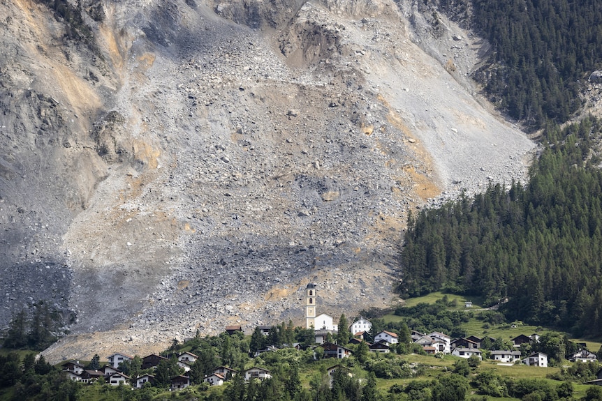 Somewhere between 1.2 and 1.5 million cubic metres of rock has come down the slope towards Brienz.(AP: Michael Buholzer)