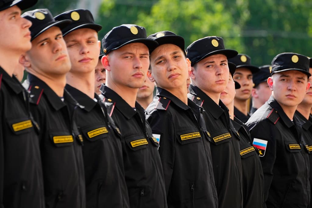 Russian conscripts at St. Petersburg during a send-off event before they head to assigned military units for mandatory one-year military service, May 23, 2023. AP/Dmitri Lovetsky