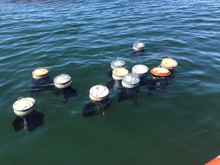 Peer-Reviewed PublicationIMAGE: NEARLY A DOZEN OF THE BARREL-SHAPED DRIFTERS FLOAT AS A LOOSE GROUP IN THE CALM SEAWATER. USING ADVANCED SATELLITE-TRACKED SURFACE DRIFTERS, THE RESEARCH TEAM WAS ABLE TO INVESTIGATE THE DISTRIBUTION PATHWAYS OF THE PLASTIC DEBRIS. view more