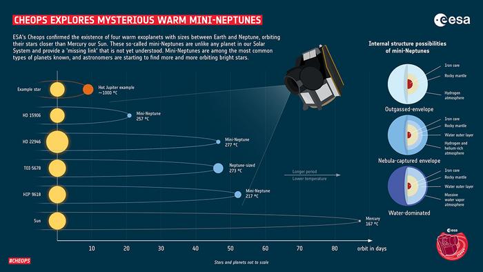 Peer-Reviewed PublicationIMAGE: CHEOPS CONFIRMED THE EXISTENCE OF FOUR WARM EXOPLANETS WITH SIZES BETWEEN EARTH AND NEPTUNE, ORBITING THEIR STARS CLOSER THAN MERCURY OUR SUN. THESE SO-CALLED MINI- NEPTUNES ARE UNLIKE ANY PLANET IN OUR SOLAR SYSTEM AND PROVIDE A 'MISSING LINK' THAT IS NOT YET UNDERSTOOD. MINI-NEPTUNES ARE AMONG THE MOST COMMON TYPES OF PLANETS KNOWN, AND ASTRONOMERS ARE STARTING TO FIND MORE AND MORE ORBITING BRIGHT STARS. view more