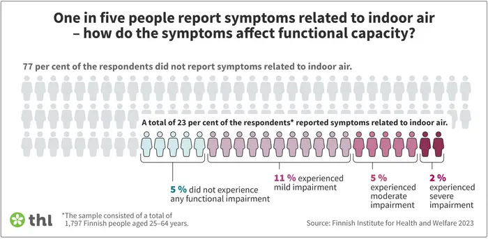 Approximately one in five people in Finland reported they experienced symptoms related to indoor air. Some of them did not think the symptoms affected their functional capacity at all, but a small part found that the symptoms caused significant functional impairment.