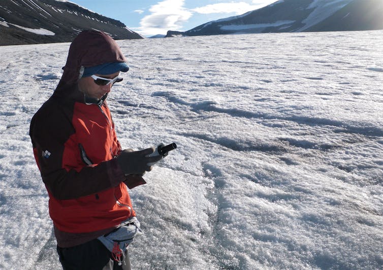 Nozomu Takeuchi measuring the biological darkening of a Svalbard glacier in 2011.