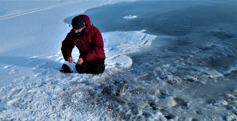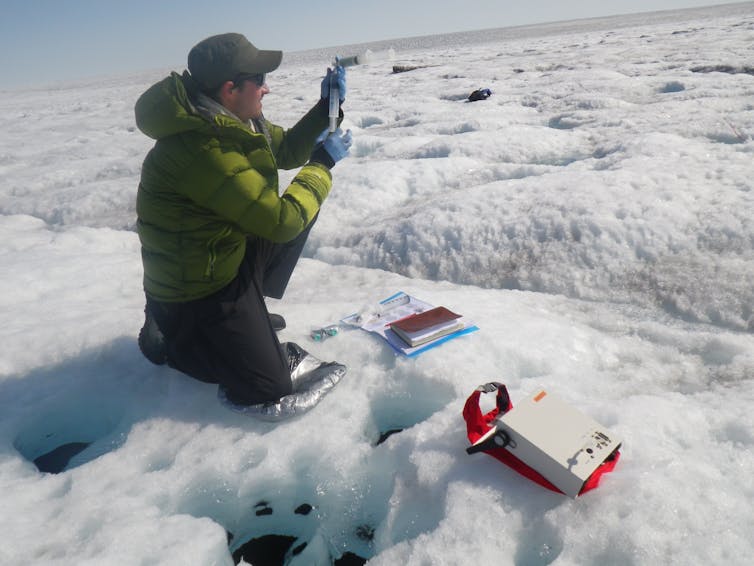 Joseph Cook measuring the carbon cycling activities of Greenland’s cryoconite holes.